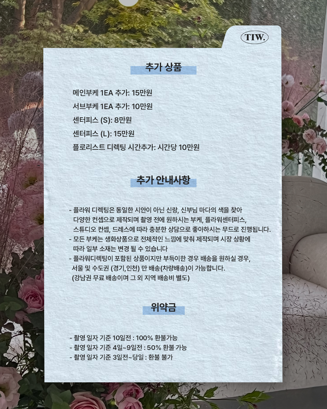 | 추가상품 (할인없음) | * 메인부케 1EA 추가 : +15만원 * 서브부케 1EA 추가 : +10만원 * 센터피스 (S) : +8만원 * 센터피스 (L) : +15만원 * 플로리스트 디렉팅 시간추가 : 시간당 +10만원 | |