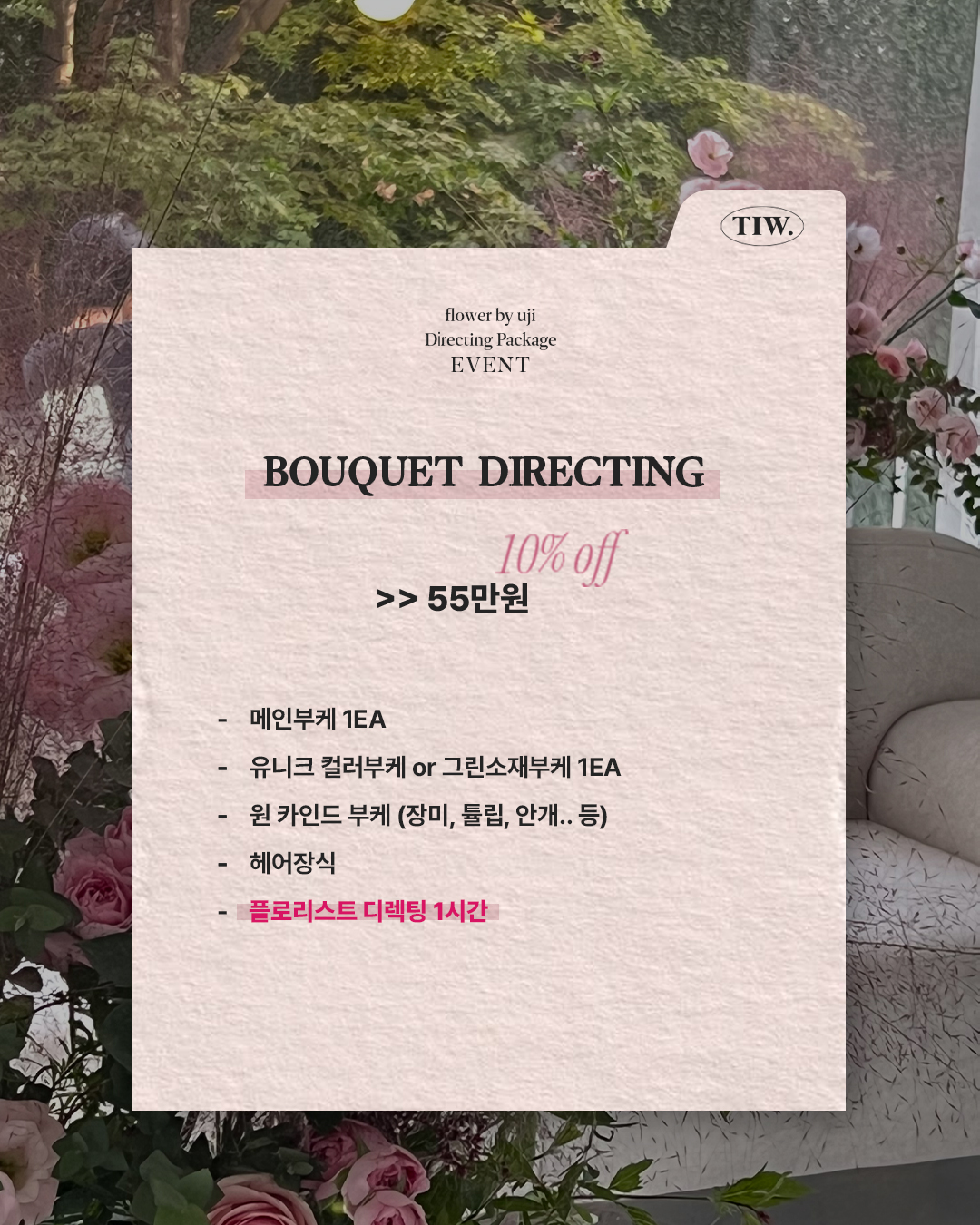 | BOUQUET DERECTING | 55만원 (10% 할인) | * 메인부케 1EA * 유니크 컬러부케 or 그린소재부케 1EA * 원 카인드 부케 (장미, 튤립, 안개.. 등) * 헤어장식 *플로리스트 디렉팅 1시간 |